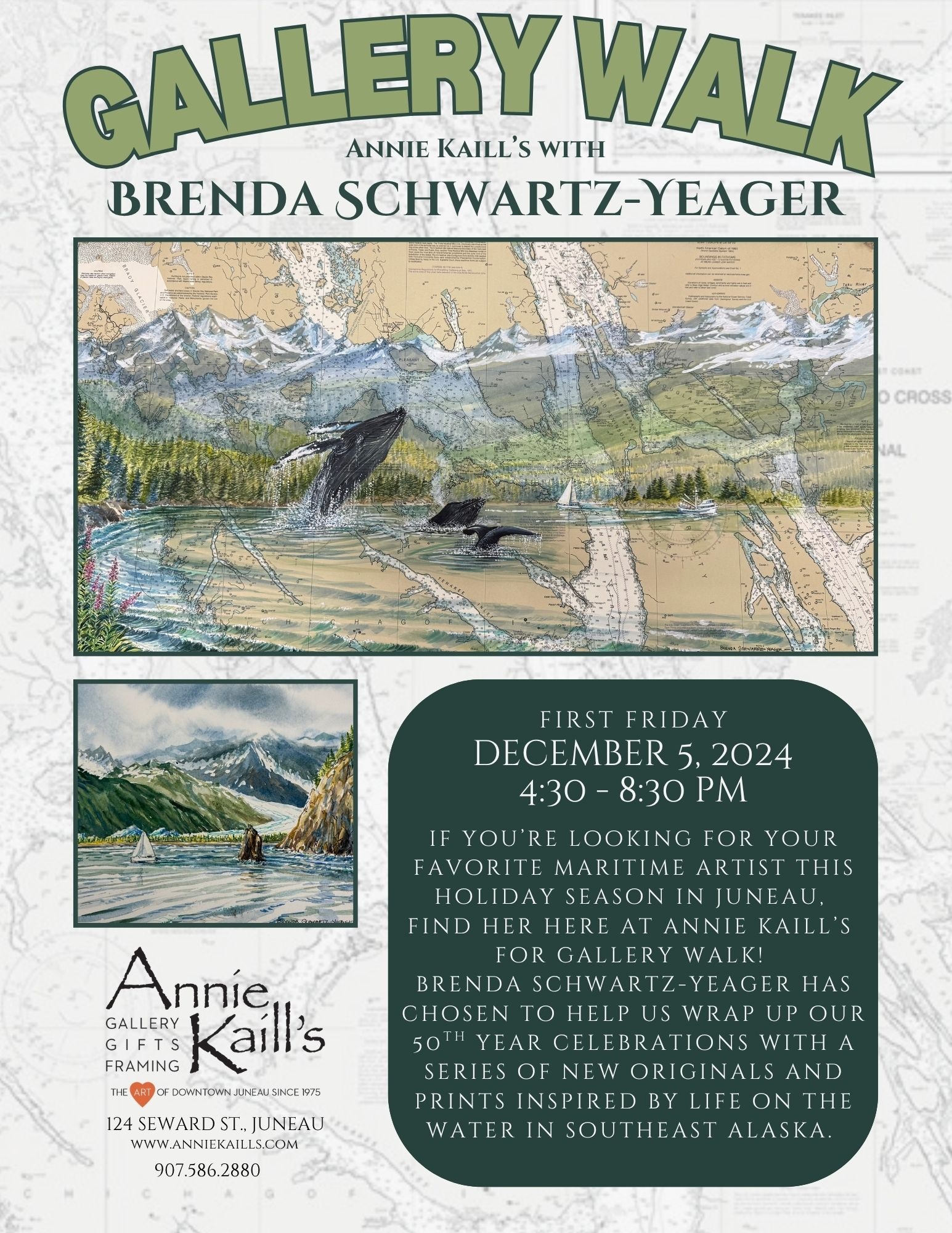 If you’re looking for your favorite maritime artist this holiday season in Juneau, find her here at Annie Kaill’s for Gallery Walk!